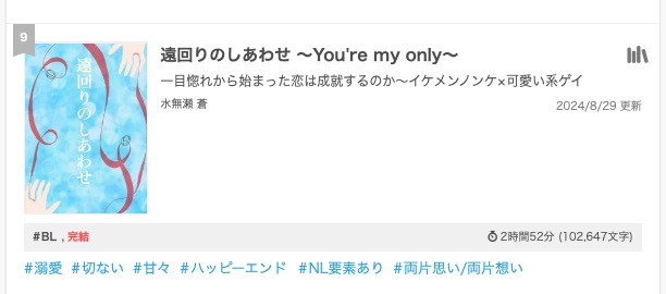 そして、このサイト以外で投稿サイトに投稿しているのですが、エブリスタでBLのトレンドランキングで9位に入らせて頂きました!